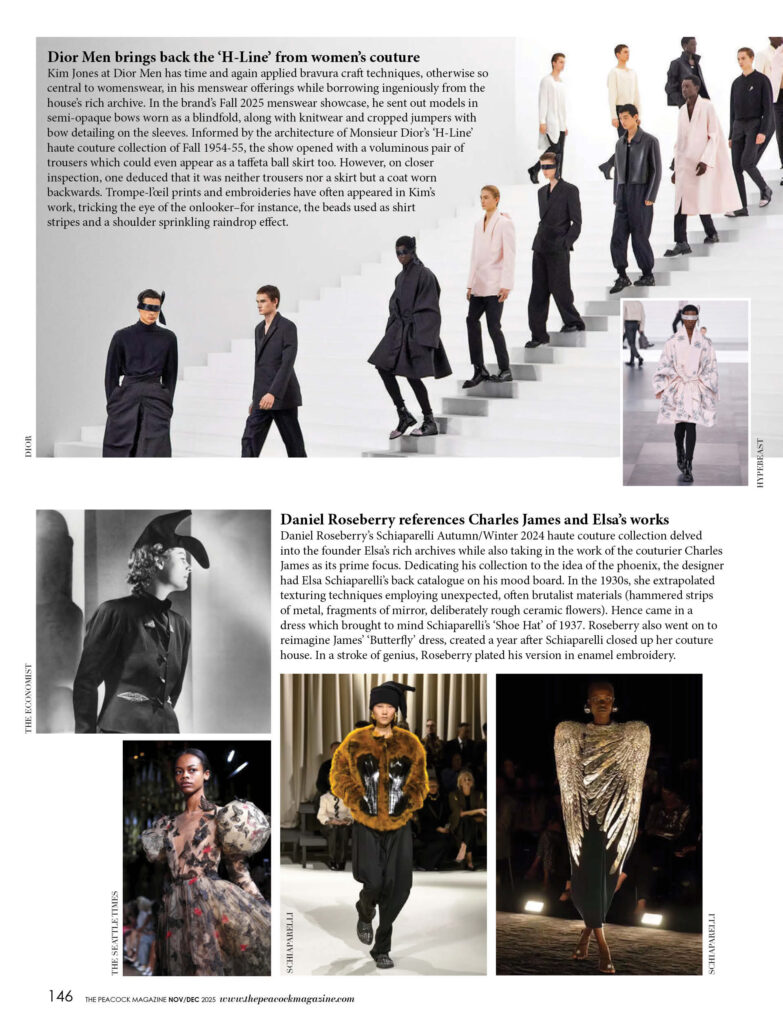 Kim Jones at Dior Men has time and again applied bravura craft techniques, otherwise so central to womenswear, in his menswear offerings while borrowing ingeniously from the house’s rich archive. In the brand’s Fall 2025 menswear showcase, he sent out models in semi-opaque bows worn as a blindfold, along with knitwear and cropped jumpers with bow detailing on the sleeves. Informed by the architecture of Monsieur Dior’s ‘H-Line’ haute couture collection of Fall 1954-55, the show opened with a voluminous pair of trousers which could even appear as a taffeta ball skirt too. However, on closer inspection, one deduced that it was neither trousers nor a skirt but a coat worn backwards. Trompe-l’œil prints and embroideries have often appeared in Kim’s work, tricking the eye of the onlooker–for instance, the beads used as shirt stripes and a shoulder sprinkling raindrop effect.