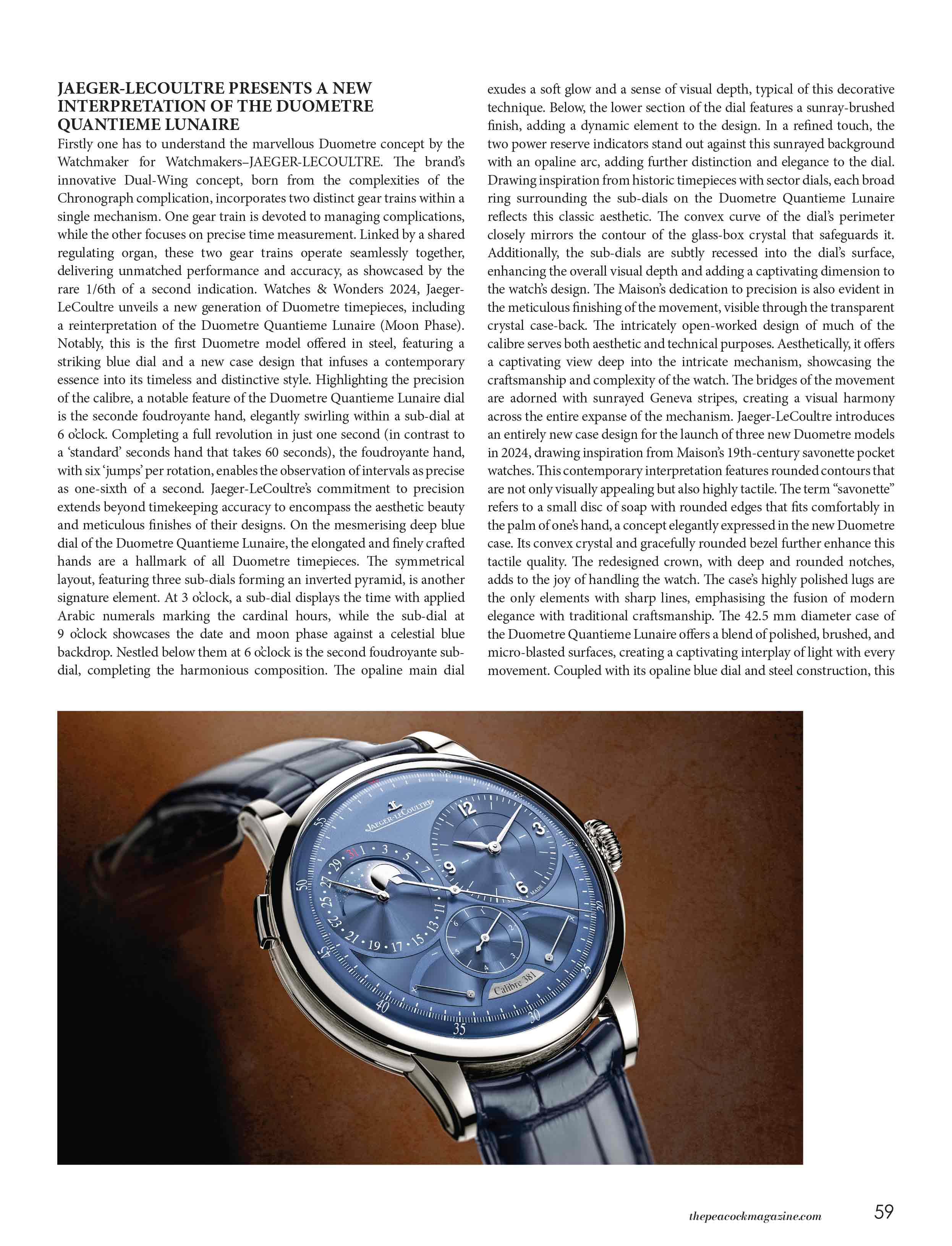 Firstly one has to understand the marvellous Duometre concept by the Watchmaker for Watchmakers–JAEGER-LECOULTRE. The brand’s innovative Dual-Wing concept, born from the complexities of the Chronograph complication, incorporates two distinct gear trains within a single mechanism. One gear train is devoted to managing complications, while the other focuses on precise time measurement. Linked by a shared regulating organ, these two gear trains operate seamlessly together, delivering unmatched performance and accuracy, as showcased by the rare 1/6th of a second indication. Watches & Wonders 2024, Jaeger-LeCoultre unveils a new generation of Duometre timepieces, including a reinterpretation of the Duometre Quantieme Lunaire (Moon Phase). Notably, this is the first Duometre model offered in steel, featuring a striking blue dial and a new case design that infuses a contemporary essence into its timeless and distinctive style. Highlighting the precision of the calibre, a notable feature of the Duometre Quantieme Lunaire dial is the seconde foudroyante hand, elegantly swirling within a sub-dial at 6 o’clock. Completing a full revolution in just one second (in contrast to a ‘standard’ seconds hand that takes 60 seconds), the foudroyante hand, with six ‘jumps’ per rotation, enables the observation of intervals as precise as one-sixth of a second. Jaeger-LeCoultre’s commitment to precision extends beyond timekeeping accuracy to encompass the aesthetic beauty and meticulous finishes of their designs. On the mesmerising deep blue dial of the Duometre Quantieme Lunaire, the elongated and finely crafted hands are a hallmark of all Duometre timepieces. The symmetrical layout, featuring three sub-dials forming an inverted pyramid, is another signature element. At 3 o’clock, a sub-dial displays the time with applied Arabic numerals marking the cardinal hours, while the sub-dial at 9 o’clock showcases the date and moon phase against a celestial blue backdrop. Nestled below them at 6 o’clock is the second foudroyante sub-dial, completing the harmonious composition. The opaline main dial exudes a soft glow and a sense of visual depth, typical of this decorative technique. Below, the lower section of the dial features a sunray-brushed finish, adding a dynamic element to the design. In a refined touch, the two power reserve indicators stand out against this sunrayed background with an opaline arc, adding further distinction and elegance to the dial. Drawing inspiration from historic timepieces with sector dials, each broad ring surrounding the sub-dials on the Duometre Quantieme Lunaire reflects this classic aesthetic. The convex curve of the dial’s perimeter closely mirrors the contour of the glass-box crystal that safeguards it. Additionally, the sub-dials are subtly recessed into the dial’s surface, enhancing the overall visual depth and adding a captivating dimension to the watch’s design. The Maison’s dedication to precision is also evident in the meticulous finishing of the movement, visible through the transparent crystal case-back. The intricately open-worked design of much of the calibre serves both aesthetic and technical purposes. Aesthetically, it offers a captivating view deep into the intricate mechanism, showcasing the craftsmanship and complexity of the watch. The bridges of the movement are adorned with sunrayed Geneva stripes, creating a visual harmony across the entire expanse of the mechanism. Jaeger-LeCoultre introduces an entirely new case design for the launch of three new Duometre models in 2024, drawing inspiration from Maison’s 19th-century savonette pocket watches. This contemporary interpretation features rounded contours that are not only visually appealing but also highly tactile. The term “savonette” refers to a small disc of soap with rounded edges that fits comfortably in the palm of one’s hand, a concept elegantly expressed in the new Duometre case. Its convex crystal and gracefully rounded bezel further enhance this tactile quality. The redesigned crown, with deep and rounded notches, adds to the joy of handling the watch. The case’s highly polished lugs are the only elements with sharp lines, emphasising the fusion of modern elegance with traditional craftsmanship. The 42.5 mm diameter case of the Duometre Quantieme Lunaire offers a blend of polished, brushed, and micro-blasted surfaces, creating a captivating interplay of light with every movement. Coupled with its opaline blue dial and steel construction, this reinterpretation of the timepiece exudes a contemporary charm while maintaining technical sophistication. Powering this watch is the manually wound Jaeger-LeCoultre Calibre 381, renowned for its precision and reliability. Its impressive array of functions includes hour, minute, central seconds, 1/6th of a second measurement, moon phases, date display, and two power reserves of 50 hours each, ensuring optimal performance and convenience for the wearer.