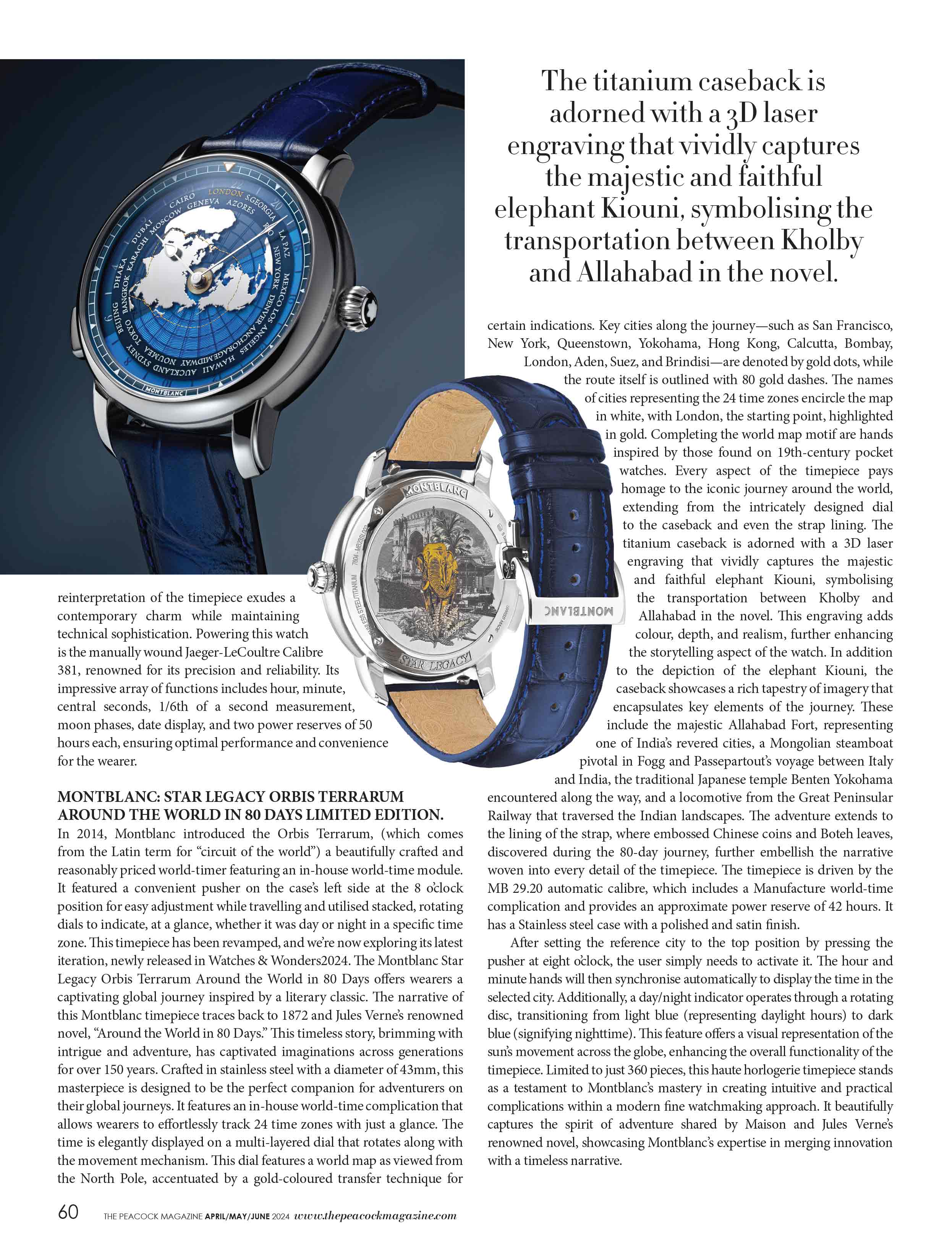 In 2014, Montblanc introduced the Orbis Terrarum, (which comes from the Latin term for “circuit of the world”) a beautifully crafted and reasonably priced world-timer featuring an in-house world-time module. It featured a convenient pusher on the case’s left side at the 8 o’clock position for easy adjustment while travelling and utilised stacked, rotating dials to indicate, at a glance, whether it was day or night in a specific time zone. This timepiece has been revamped, and we’re now exploring its latest iteration, newly released in Watches & Wonders2024. The Montblanc Star Legacy Orbis Terrarum Around the World in 80 Days offers wearers a captivating global journey inspired by a literary classic. The narrative of this Montblanc timepiece traces back to 1872 and Jules Verne’s renowned novel, “Around the World in 80 Days.” This timeless story, brimming with intrigue and adventure, has captivated imaginations across generations for over 150 years. Crafted in stainless steel with a diameter of 43mm, this masterpiece is designed to be the perfect companion for adventurers on their global journeys. It features an in-house world-time complication that allows wearers to effortlessly track 24 time zones with just a glance. The time is elegantly displayed on a multi-layered dial that rotates along with the movement mechanism. This dial features a world map as viewed from the North Pole, accentuated by a gold-coloured transfer technique for certain indications. Key cities along the journey—such as San Francisco, New York, Queenstown, Yokohama, Hong Kong, Calcutta, Bombay, London, Aden, Suez, and Brindisi—are denoted by gold dots, while the route itself is outlined with 80 gold dashes. The names of cities representing the 24 time zones encircle the map in white, with London, the starting point, highlighted in gold. Completing the world map motif are hands inspired by those found on 19th-century pocket watches. Every aspect of the timepiece pays homage to the iconic journey around the world, extending from the intricately designed dial to the caseback and even the strap lining. The titanium caseback is adorned with a 3D laser engraving that vividly captures the majestic and faithful elephant Kiouni, symbolising the transportation between Kholby and Allahabad in the novel. This engraving adds colour, depth, and realism, further enhancing the storytelling aspect of the watch. In addition to the depiction of the elephant Kiouni, the caseback showcases a rich tapestry of imagery that encapsulates key elements of the journey. These include the majestic Allahabad Fort, representing one of India’s revered cities, a Mongolian steamboat pivotal in Fogg and Passepartout’s voyage between Italy and India, the traditional Japanese temple Benten Yokohama encountered along the way, and a locomotive from the Great Peninsular Railway that traversed the Indian landscapes. The adventure extends to the lining of the strap, where embossed Chinese coins and Boteh leaves, discovered during the 80-day journey, further embellish the narrative woven into every detail of the timepiece. The timepiece is driven by the MB 29.20 automatic calibre, which includes a Manufacture world-time complication and provides an approximate power reserve of 42 hours. It has a Stainless steel case with a polished and satin finish.