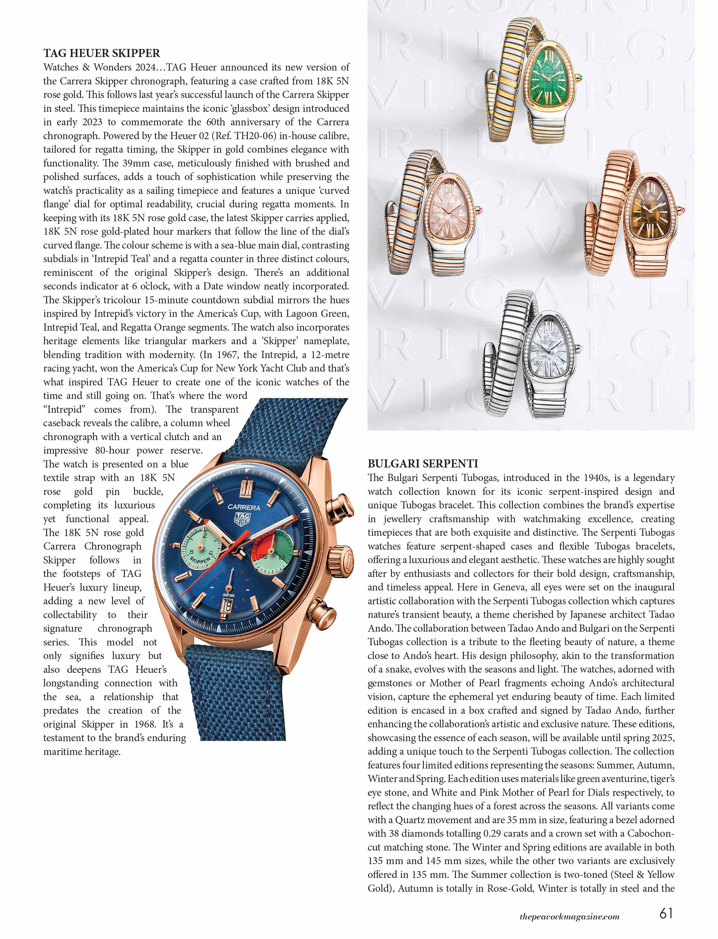 The Bulgari Serpenti Tubogas, introduced in the 1940s, is a legendary watch collection known for its iconic serpent-inspired design and unique Tubogas bracelet. This collection combines the brand’s expertise in jewellery craftsmanship with watchmaking excellence, creating timepieces that are both exquisite and distinctive. The Serpenti Tubogas watches feature serpent-shaped cases and flexible Tubogas bracelets, offering a luxurious and elegant aesthetic. These watches are highly sought after by enthusiasts and collectors for their bold design, craftsmanship, and timeless appeal. Here in Geneva, all eyes were set on the inaugural artistic collaboration with the Serpenti Tubogas collection which captures nature’s transient beauty, a theme cherished by Japanese architect Tadao Ando. The collaboration between Tadao Ando and Bulgari on the Serpenti Tubogas collection is a tribute to the fleeting beauty of nature, a theme close to Ando’s heart. His design philosophy, akin to the transformation of a snake, evolves with the seasons and light. The watches, adorned with gemstones or Mother of Pearl fragments echoing Ando’s architectural vision, capture the ephemeral yet enduring beauty of time. Each limited edition is encased in a box crafted and signed by Tadao Ando, further enhancing the collaboration’s artistic and exclusive nature. These editions, showcasing the essence of each season, will be available until spring 2025, adding a unique touch to the Serpenti Tubogas collection. The collection features four limited editions representing the seasons: Summer, Autumn, Winter and Spring. Each edition uses materials like green aventurine, tiger’s eye stone, and White and Pink Mother of Pearl for Dials respectively, to reflect the changing hues of a forest across the seasons. All variants come with a Quartz movement and are 35 mm in size, featuring a bezel adorned with 38 diamonds totalling 0.29 carats and a crown set with a Cabochon-cut matching stone. The Winter and Spring editions are available in both 135 mm and 145 mm sizes, while the other two variants are exclusively offered in 135 mm. The Summer collection is two-toned (Steel & Yellow Gold), Autumn is totally in Rose-Gold, Winter is totally in steel and the Spring is again two-toned (Steel & Rose-Gold).